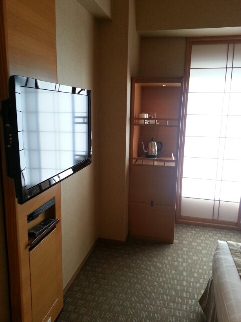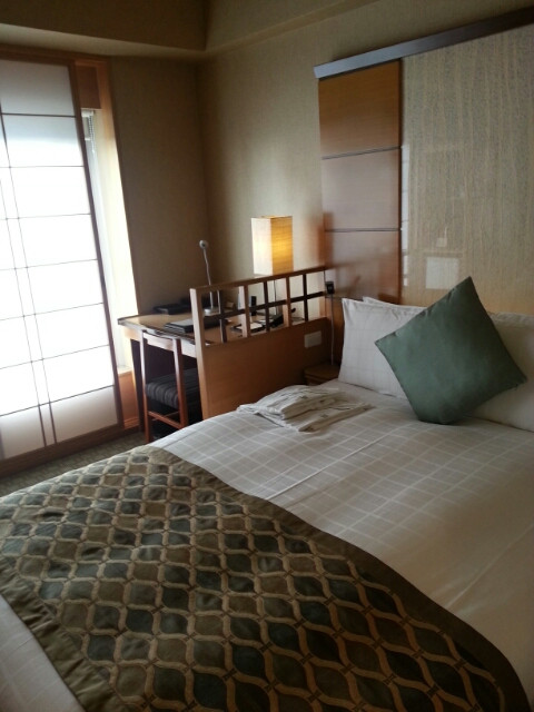 ベッドとワークデスクがあって、もうお部屋いっぱい。でもそれでも十分です。障子の向こうは窓。そして、その向こうは隣のビル。景観はあまり期待できるものではありませんでした。