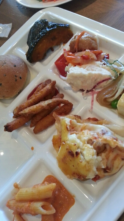 サラダ、オードブル、ピザ、たこ焼き(笑)、フライドポテト、ピラフ、ラザニア、パスタ、パン類、カレー、スープ、デザート数種、ソフトドリンク、軽めのメインが訪れた日の内容でした。軽めのメインは肉料理・魚料理の意で、この日は肉は豚ばら肉の肉豆腐、お魚は興味なかったのでうっかり失念。