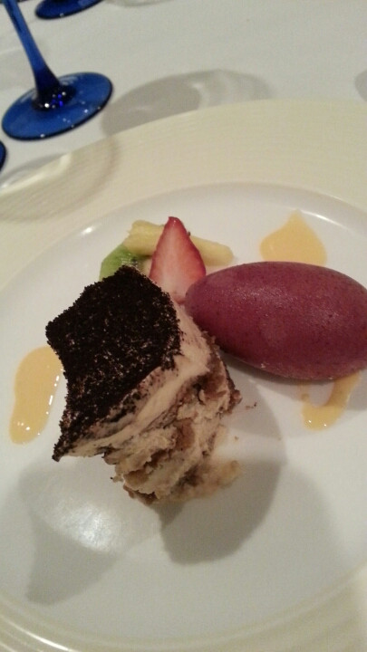 デザートはティラミスとフルーツ、カシスのシャーベットでした。これにコーヒーがついて、組合員は千円。せんえんですよ。同伴者なわたしは千五百円。
