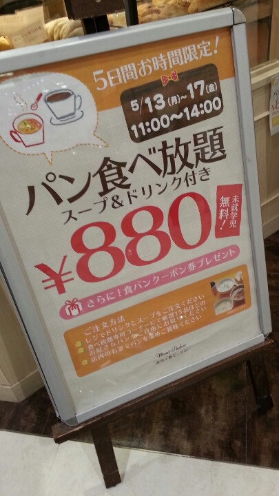 店頭ポスターを見ると、どうも、5/13~17のランチタイムはパンが食べ放題みたいです。
