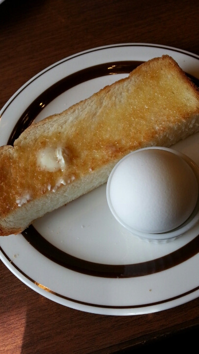 ついてくるトーストとボイルドエッグ。これだけでも十分おなかいっぱいになるのに、欲張ってスフレケーキをオーダーしてしまって、始めにもどる、というわけです。