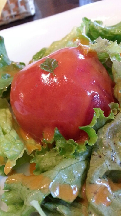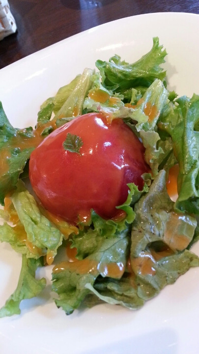 甘くて、みずみずしいトマトが使われており、これはおいしい。画像にはおさめていませんが、トマト中につめものもあってそちらとの相性も良かったです。まわりの葉っぱ群がなくても十分に満足するサラダでした。