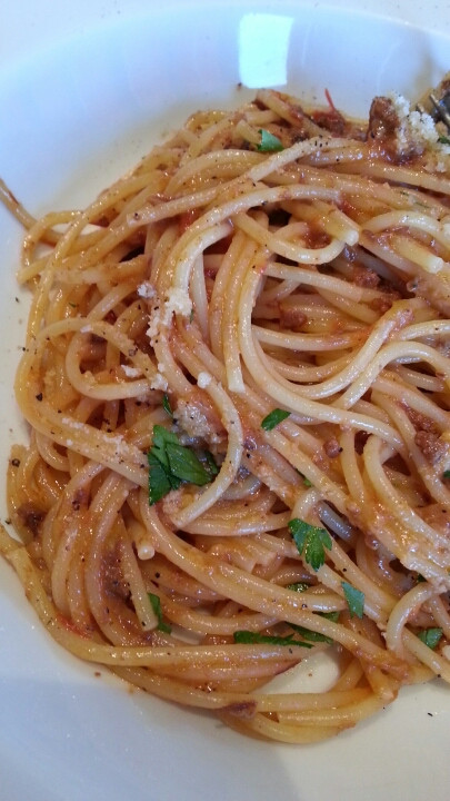 パスタは完熟トマトのボロネーゼ。