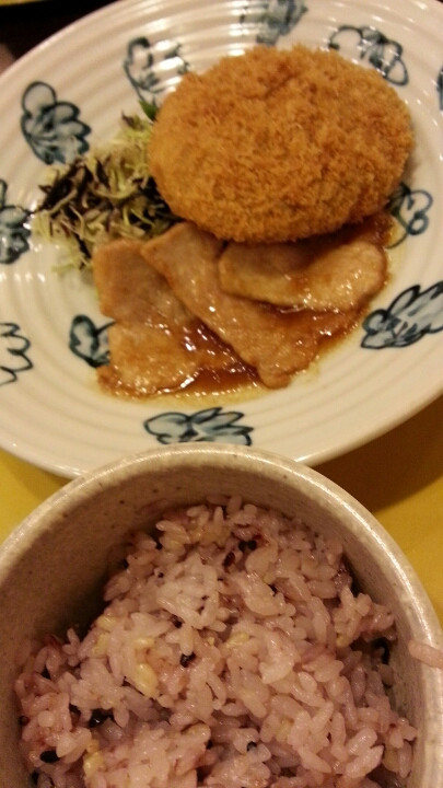 他の飲食店から比べるとちょっと寂しいカンジはありましたが、入店し、オーダーしたのは、国産豚の生姜焼きと黒豆コロッケ定食(1,080円)。