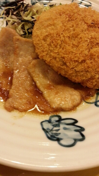 他の飲食店から比べるとちょっと寂しいカンジはありましたが、入店し、オーダーしたのは、国産豚の生姜焼きと黒豆コロッケ定食(1,080円)。