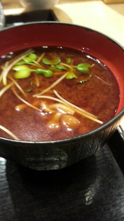 席についてオーダーすると、てんつゆ、ごはん、赤だしのセットが置かれます。左下に見えるのは頂き放題な生姜テイストなおつけものです。