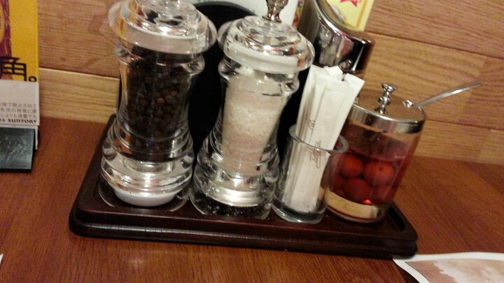テーブルはいわゆるロードサイドのハイエナさんグループや、ひばりのマークの一連ファミレスより大きいようでゆったりしているように感じました。そして、特記はごはん(こしひかりらしいよ)用に梅干しとふりかけが各テーブルに常備されていること。梅干しって初めて見ましたよ。ファミレスで梅干し。