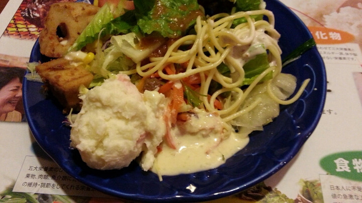 サラダバーはお皿一枚があてがわれてそれでとりに行きます。都度取り換えじゃないのが他と異なるのであるいみ違和感。