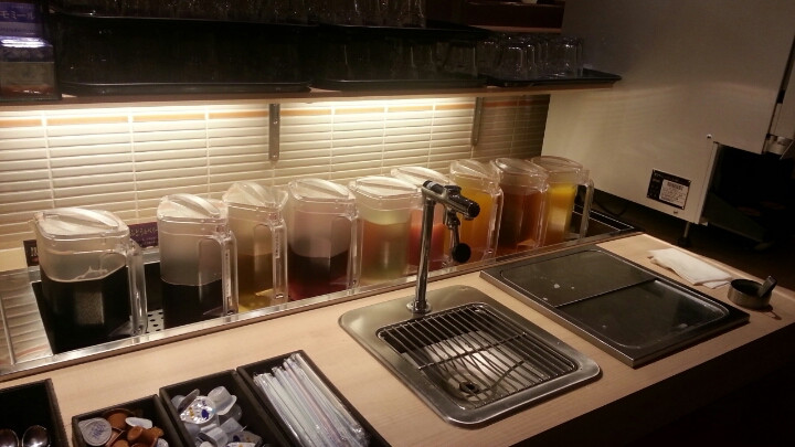 ドリンクバーは189円。ベンダーはサントリー系(ペプシとかのです)でして、それ以外の100%ジュースがこのように個別ポットにいれてあります。リンゴ酢やら黒烏龍茶やらあり充実です。ホットドリンクももちろんあります。これはいいですね。