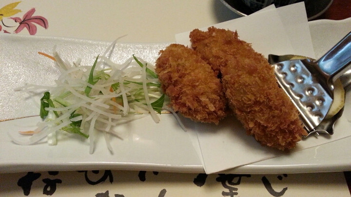 こちらはコースにふくまれていないカキフライ。手違いで、とおっしゃられてお詫びいただきましたが、かえって恐縮です。へへへ、トクしちゃいました。