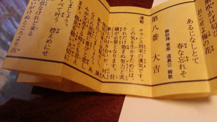 太宰府天満宮でひいたおみくじ。大吉。歌も知ってるものだったのでなんだかテンションあがりました(^▽^)