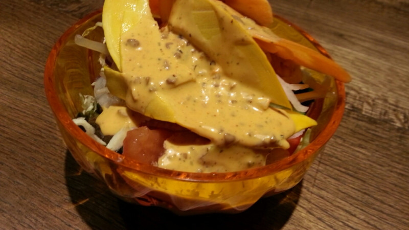 補充が追い付いていないのでちょっとだけいただいたサラダはこんなカンジです。補充にも加えて、たまたま案内いただいた席が立ったり座ったりするには遠慮しなければと思うような狭さだったということもあります。
