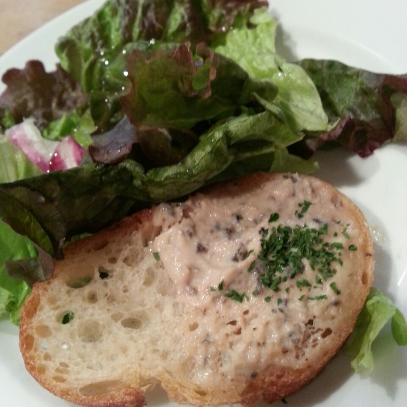 まずはサラダという位置づけでバゲットになんかのパテがぬってあるものと、葉物野菜が配膳されます。お味は悪くないのですが、パンがすでにへにょってる部分があったのがやや残念。