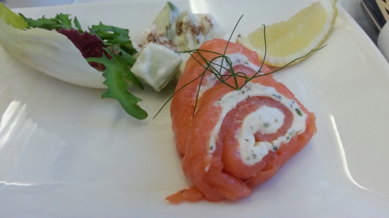 smoke salmon roulade with cream cheese and Waldorf salad