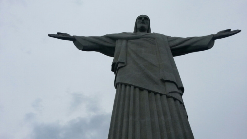 キリスト像の前で両手を広げて記念撮影です。