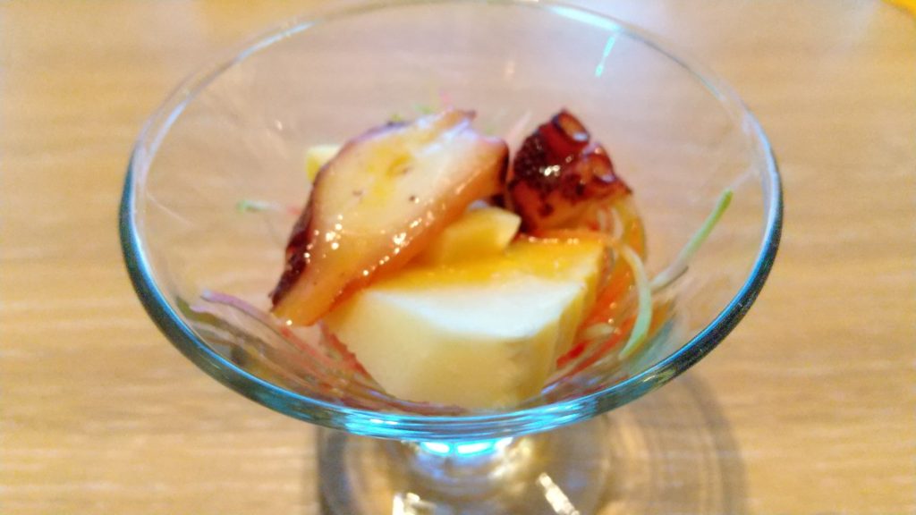暗いのでなんのこっちゃですが、ライムほど主張しない柑橘と、ちょっと塩気があるっぽいトニックとあわさり、落ち着いた印象の滋味深いジントニックでした。これまたおいしくて危険、何杯もいけそうで、お財布が泣いてしまいそうです笑。